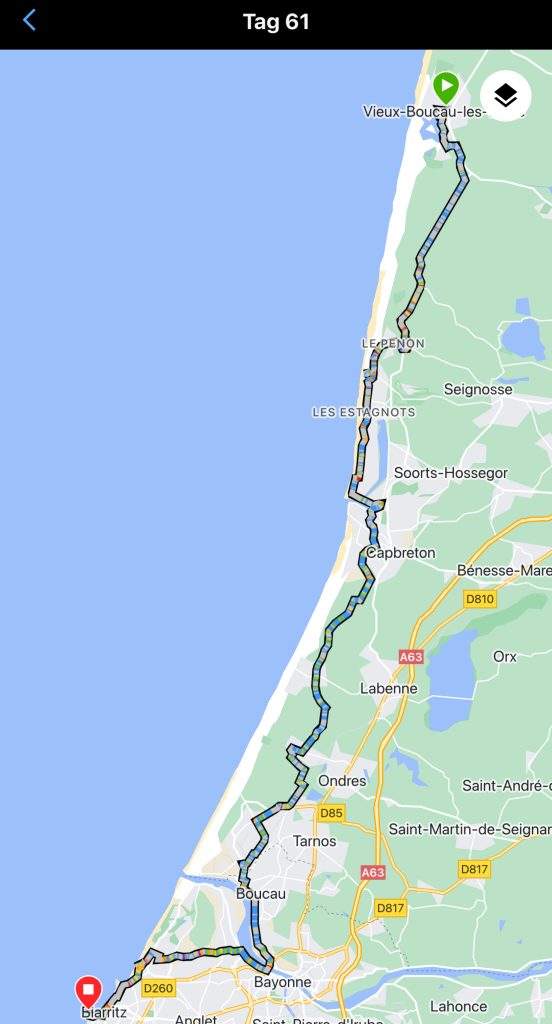 Unsere heutige Tour ist dann entsprechend „kurz“ geworden. Biarritz anschauen war die kurze Strecke wert. Ausserdem ist es erst einmal für längere Zeit die letzte Nacht in Frankreich. Morgen werden wir die Spanische Grenze überqueren 😎