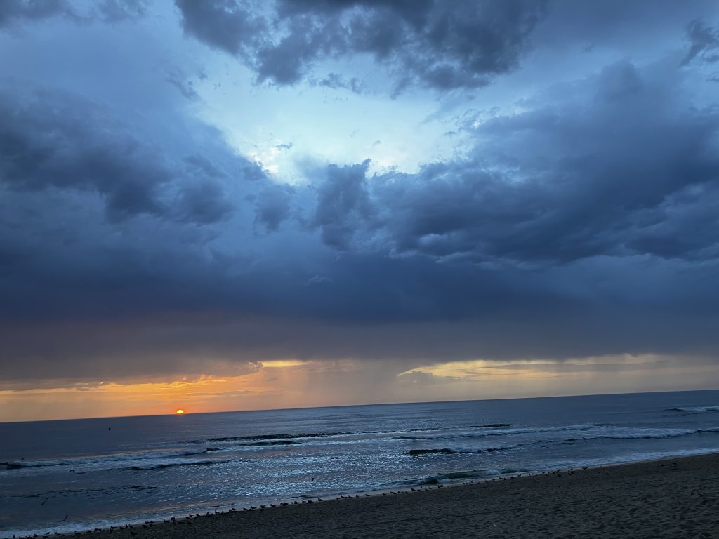 Heute mal ein ganz anderes Bild am Himmel. Dunkel, fast schon schwarz. Erst geht es an den Strand für Kaffee und Toast.