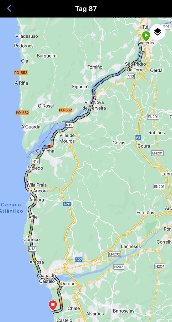 Jetzt ist es auch nicht mehr weit bis Porto. Wir schauen uns an und sind uns einig. Darauf (Großstadt) haben wir beide kein Bock 😒.