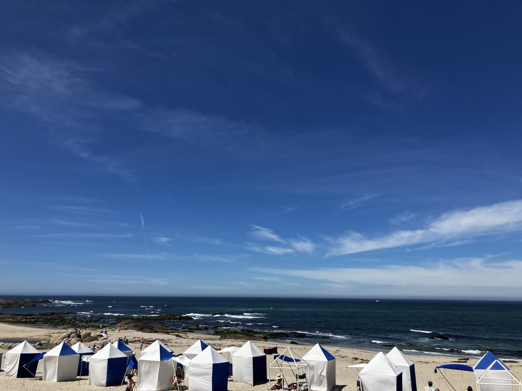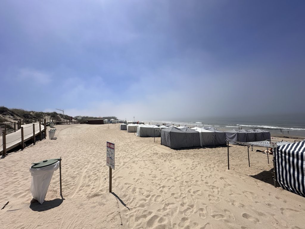 Bei Esposende erste Pause an einer Bar direkt vorm Strand. Erst ein Kaffee für mich und dann zwei 🍻 🤗. Die Sonne kommt so langsam in Gang. Der Himmel ist teilweise schon wieder blau. Der Strand ist noch nicht ganz klar.
