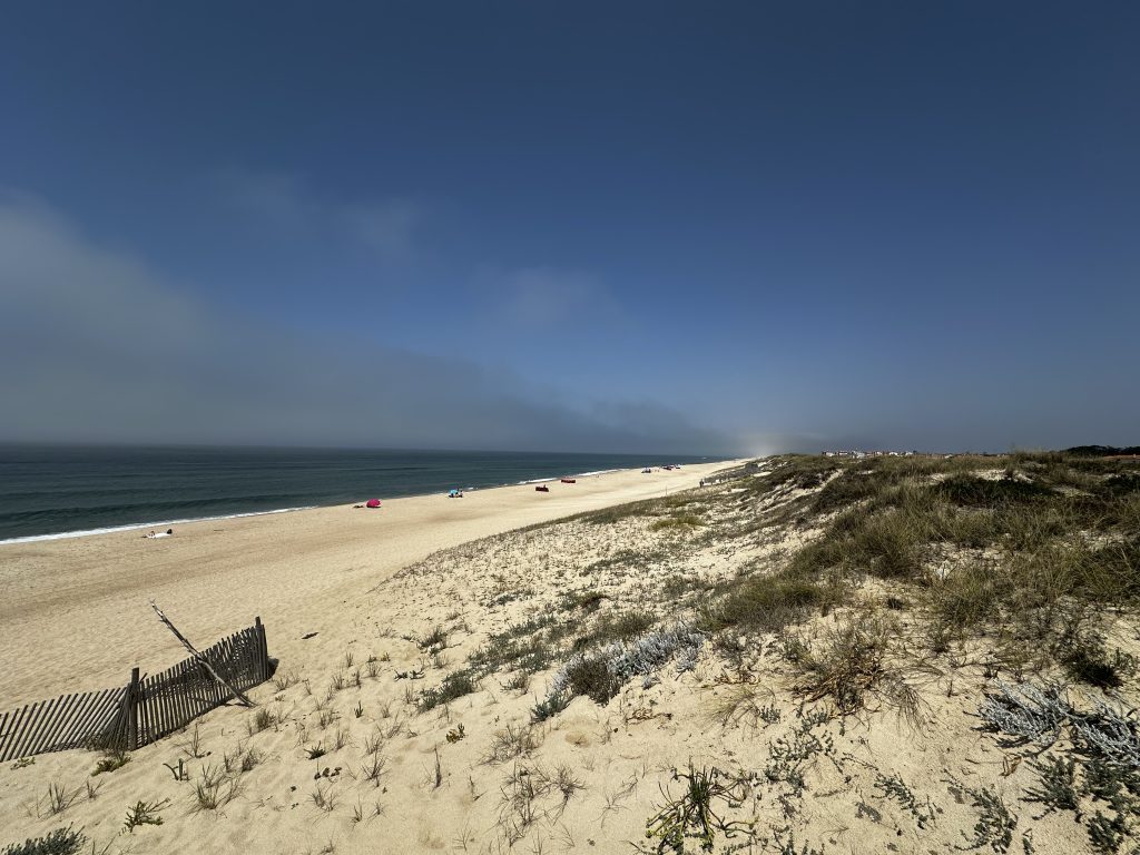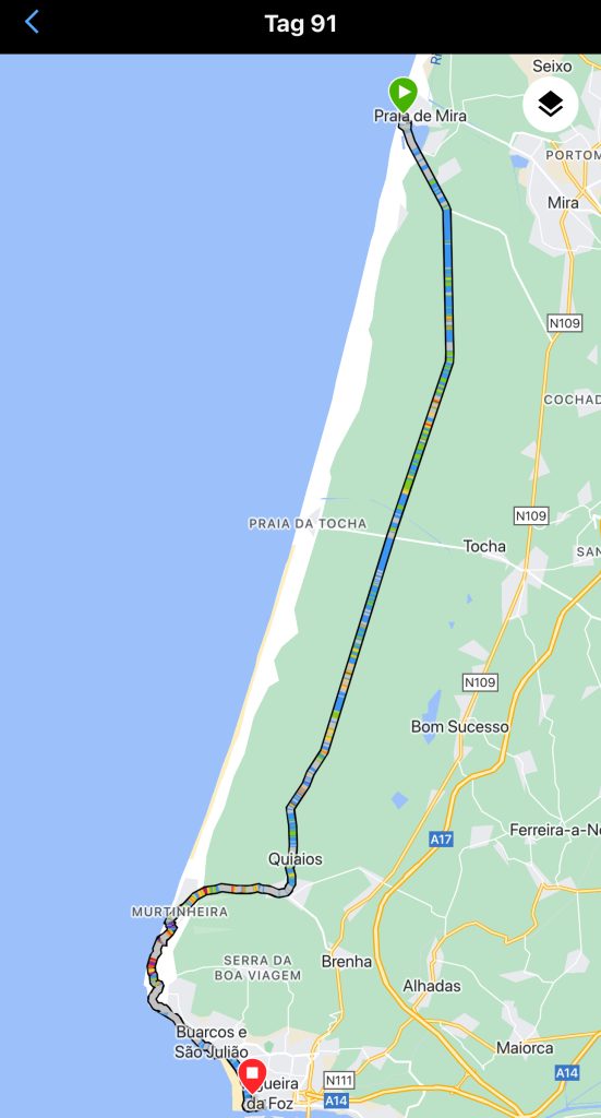 Langsam wird der Himmel wieder sehr dunkel. Die ersten ⚡️ zucken quer über den Horizont. Wir treten ordentlich in die Pedale für die letzten ca. 6 km bis Praia de Mira. Als wir angekommen tröpfelt es leicht. Geschafft.