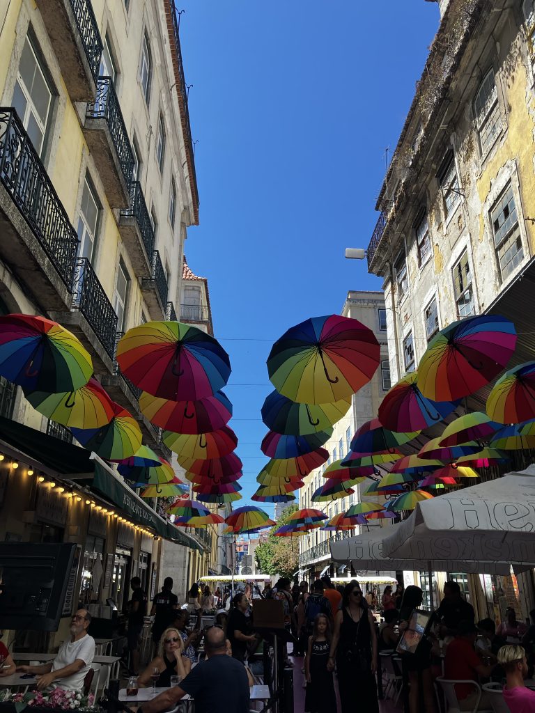 Nun sitzen wir, ich denke: mittlerweile unser Lieblingsplatz in Lisboa, im Jardim São de Pedro de Alcãntara bei Sangria im Schatten und lauschen den Klängen von zwei Musikern (E-Geige und -Gitarre) die ein Mix von wirklich tollen Klassikern spielen.