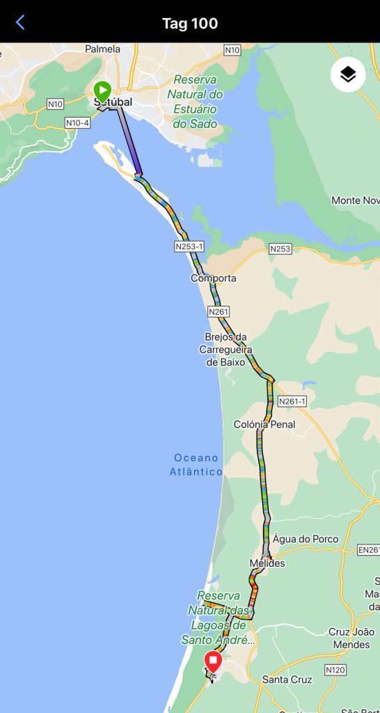 Dabei die Tour für heute neu planen, da wir nicht mit einer Fährfahrt gerechnet haben. Neues Ziel ist in Richtung Setúbal. Der Anfang der Tour verlief auch reibungslos … bis zu einem Zwischenstopp in Pinhal Verde. Da wollte uns Komoot durch die „Pampa“ führen. Man konnte eine Sandpiste im Nichts erahnen. Das konnte nicht sein 🤪🧐