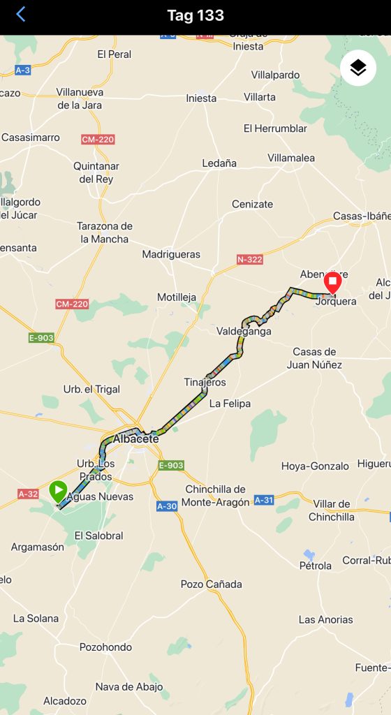 Die ersten paar Kilometer ist die Tour wie mit dem Lineal gemacht … danach geht’s auf einem Via Verde weiter bis Albacete. Beste Strecke, ansonsten wieder alles nur für Autos gemacht.