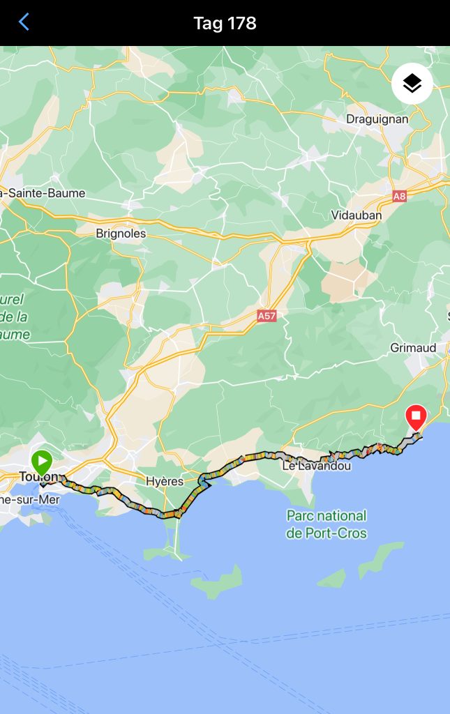So haben wir uns den Abstecher nach St. Tropez erspart. Bei den Bedingungen ist da nix wirklich zu sehen. Die Küstengewässerwaren braun und vom Türkisfarbenen Meer war nichts zu sehen. Einige Straßenabschnitte waren mit viel Unrat und Sandbänken bedeckt.